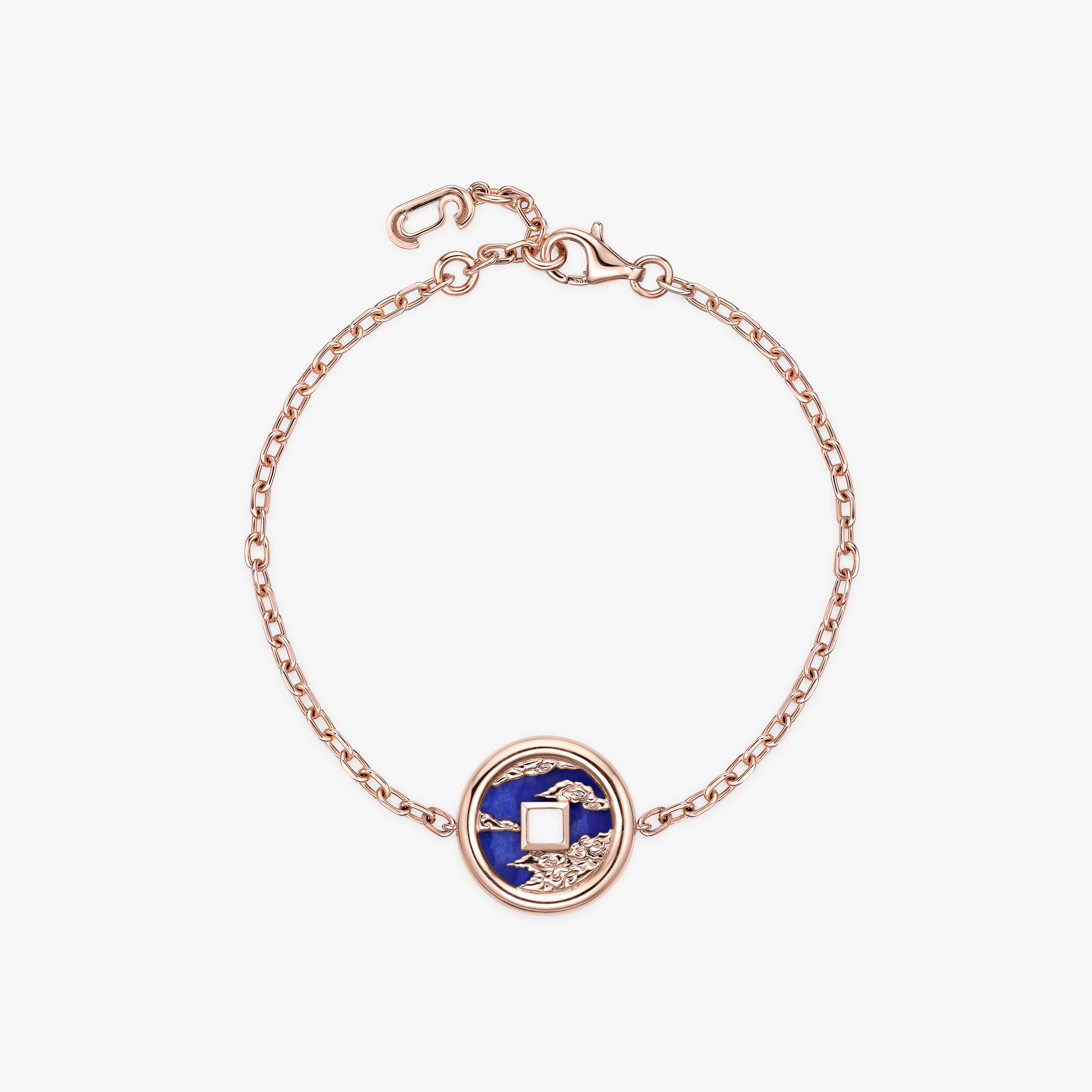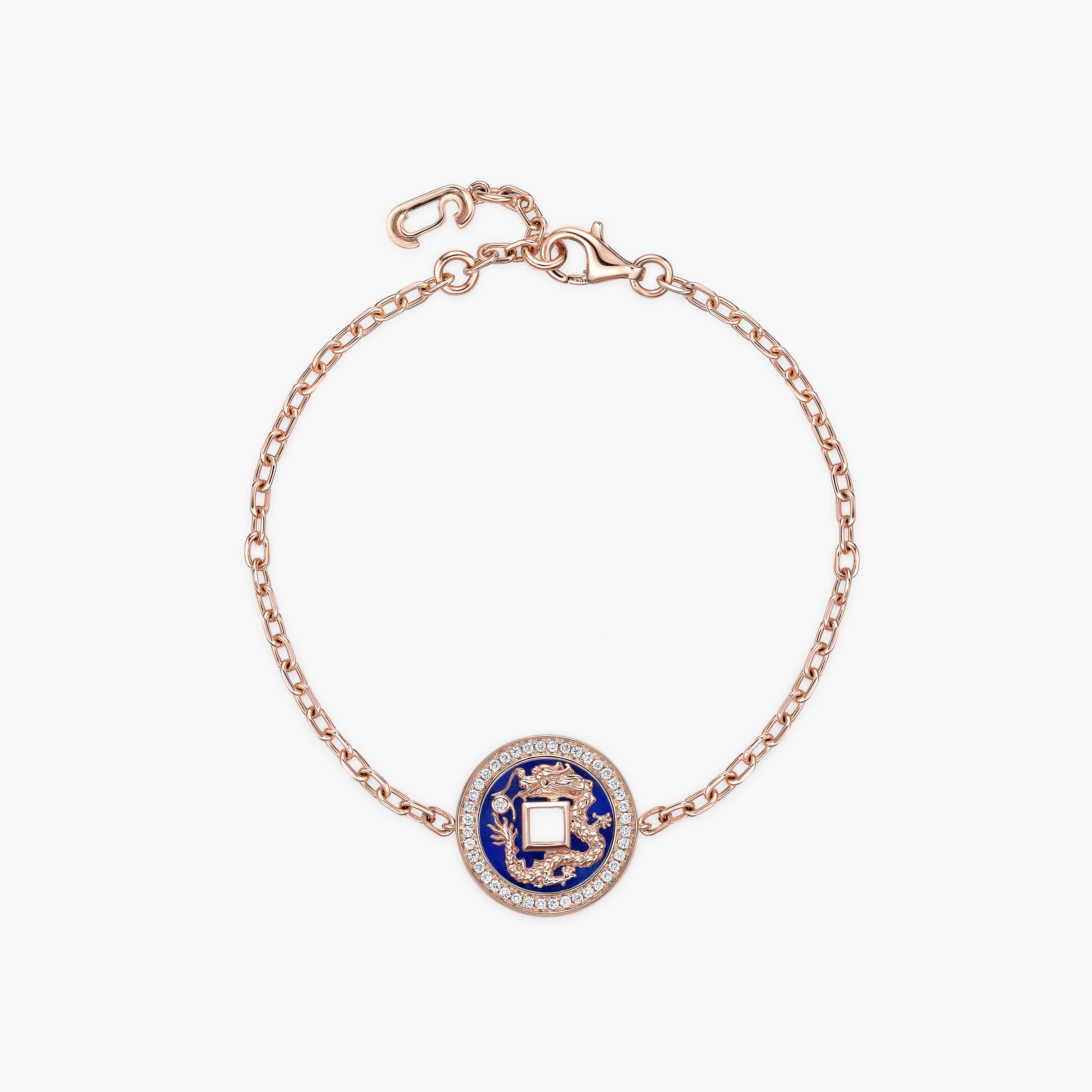 Our Eternal Dragon Bracelet is crafted from 18K recycled rose gold and adorned with ornamental stones, including onyx, mother of pearl, jade, red jasper, turquoise, and lapis lazuli. This exquisite piece blends traditional artistry with modern elegance.