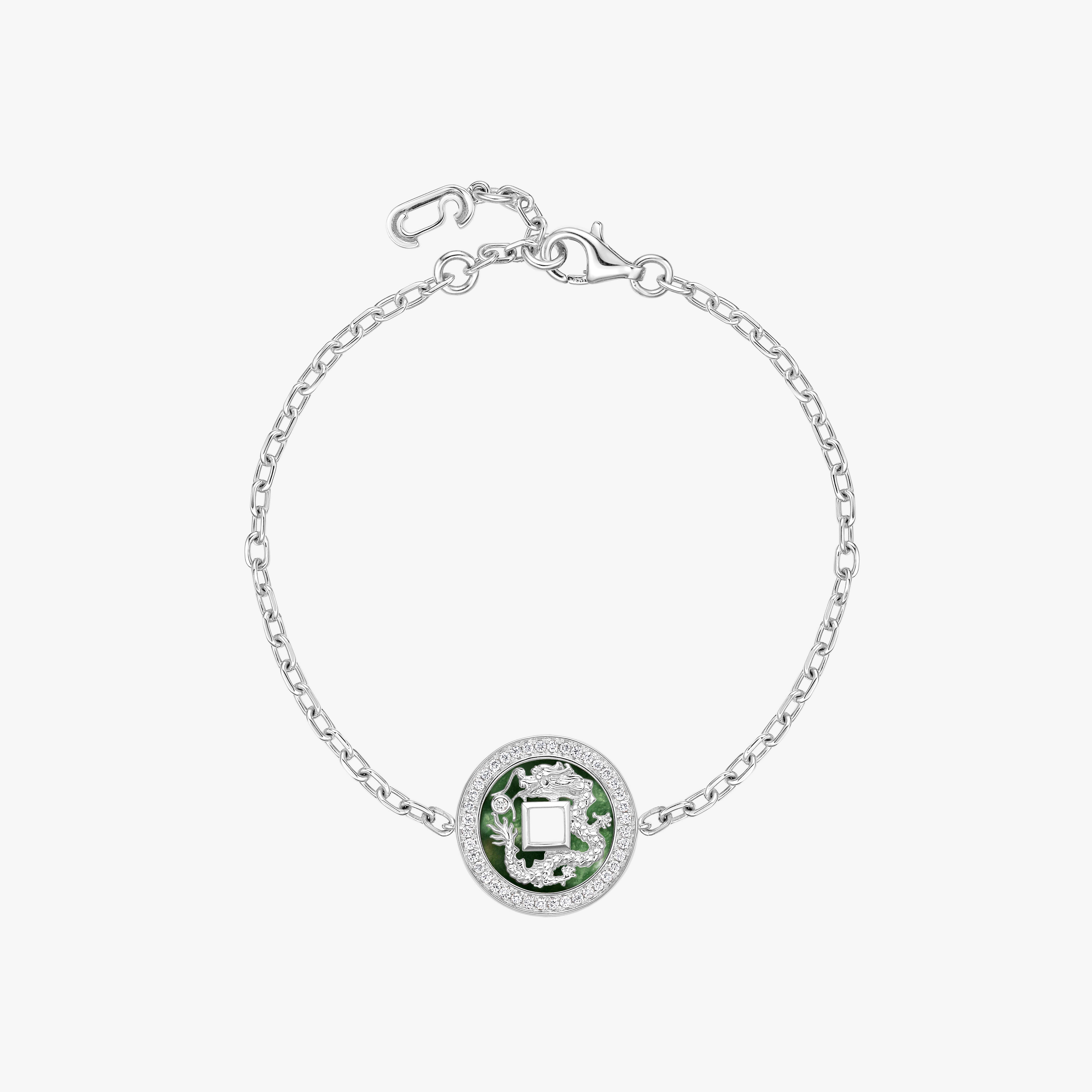 Our Eternal Dragon Bracelet is crafted from 18K recycled white gold and adorned with ornamental stones, including onyx, mother of pearl, jade, red jasper, turquoise, and lapis lazuli. This exquisite piece blends traditional artistry with modern elegance.