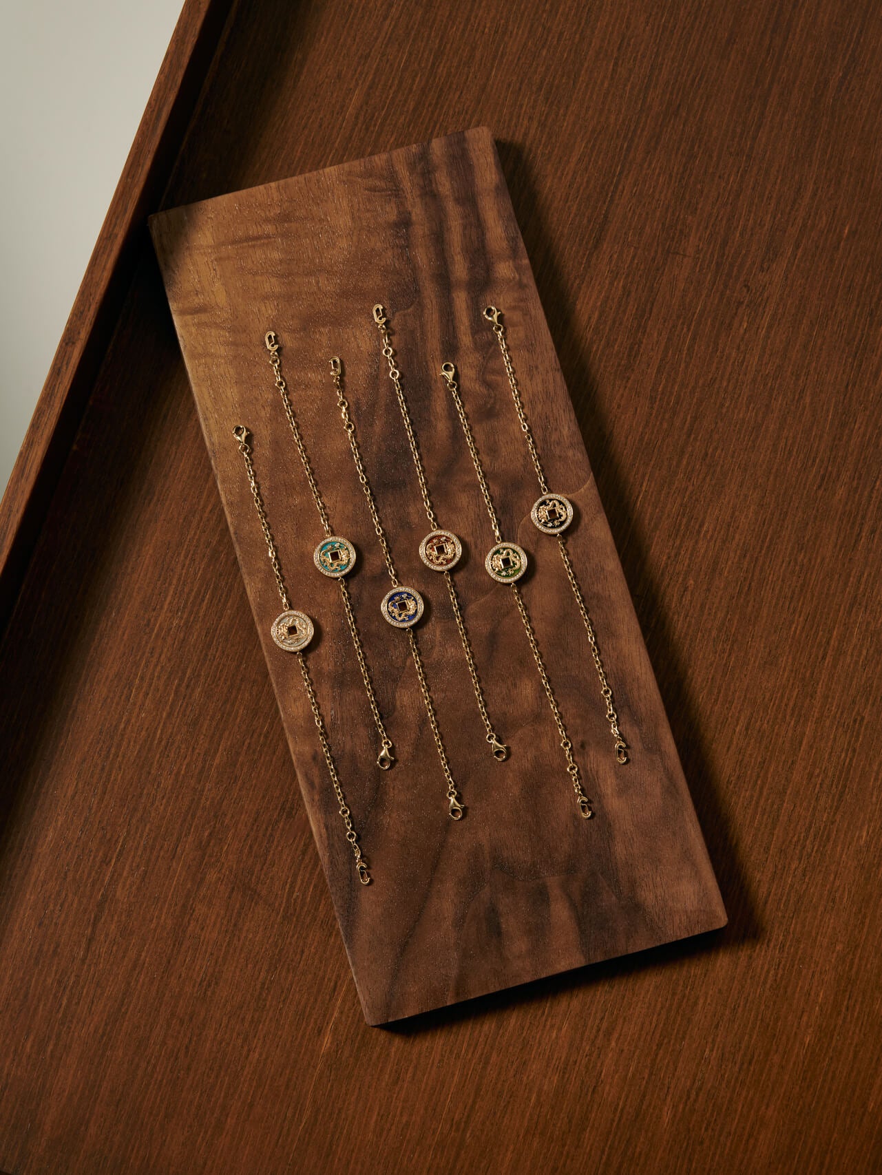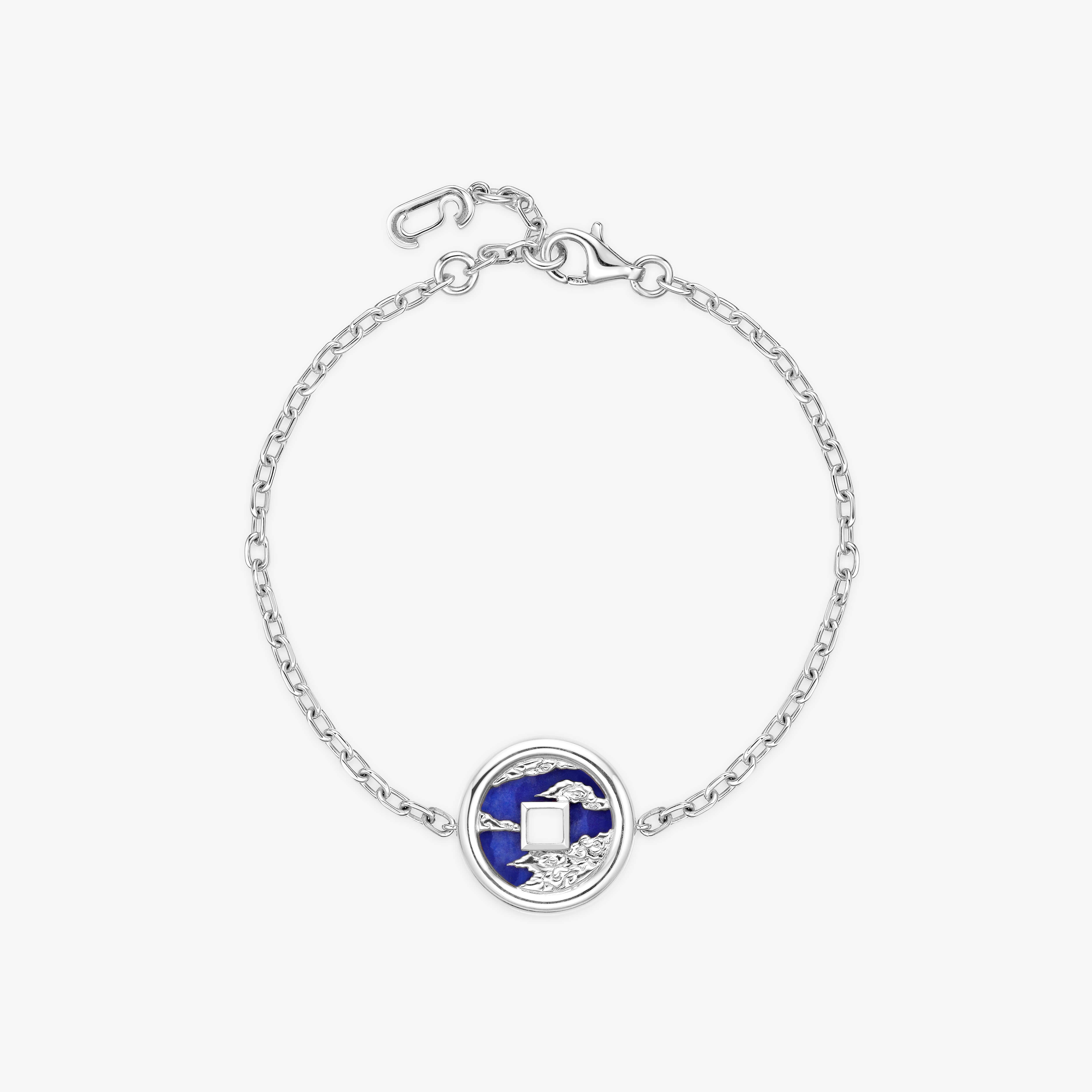 Our Eternal Dragon Bracelet is crafted from 18K recycled white gold and adorned with ornamental stones, including onyx, mother of pearl, jade, red jasper, turquoise, and lapis lazuli. This exquisite piece blends traditional artistry with modern elegance.