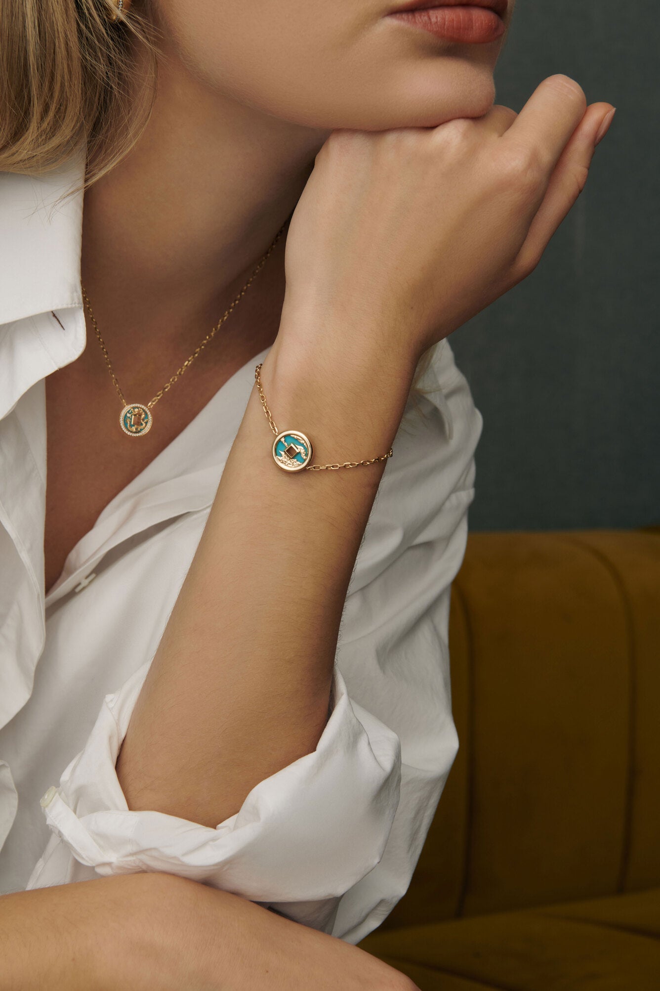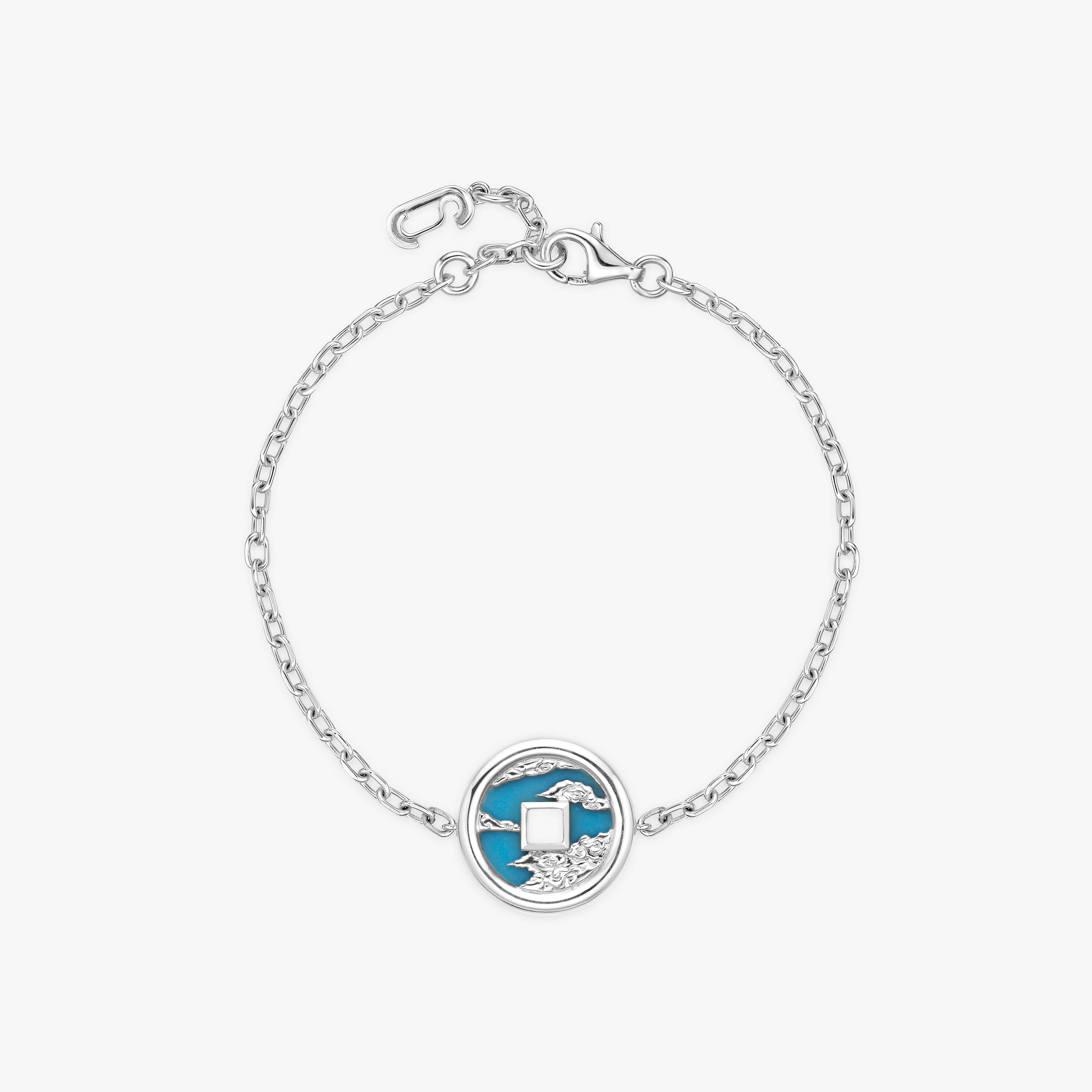 Our Eternal Dragon Bracelet is crafted from 18K recycled white gold and adorned with ornamental stones, including onyx, mother of pearl, jade, red jasper, turquoise, and lapis lazuli. This exquisite piece blends traditional artistry with modern elegance.