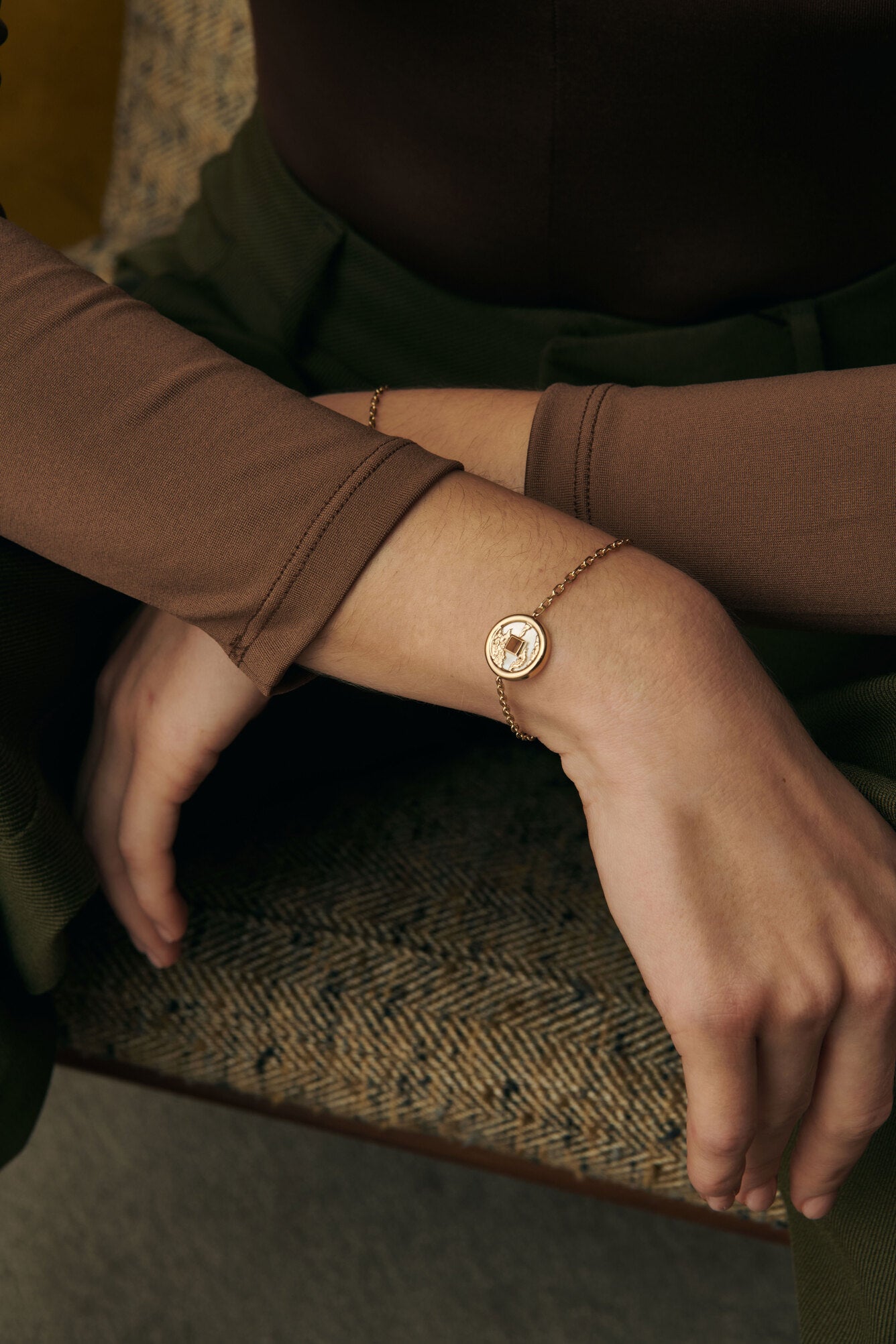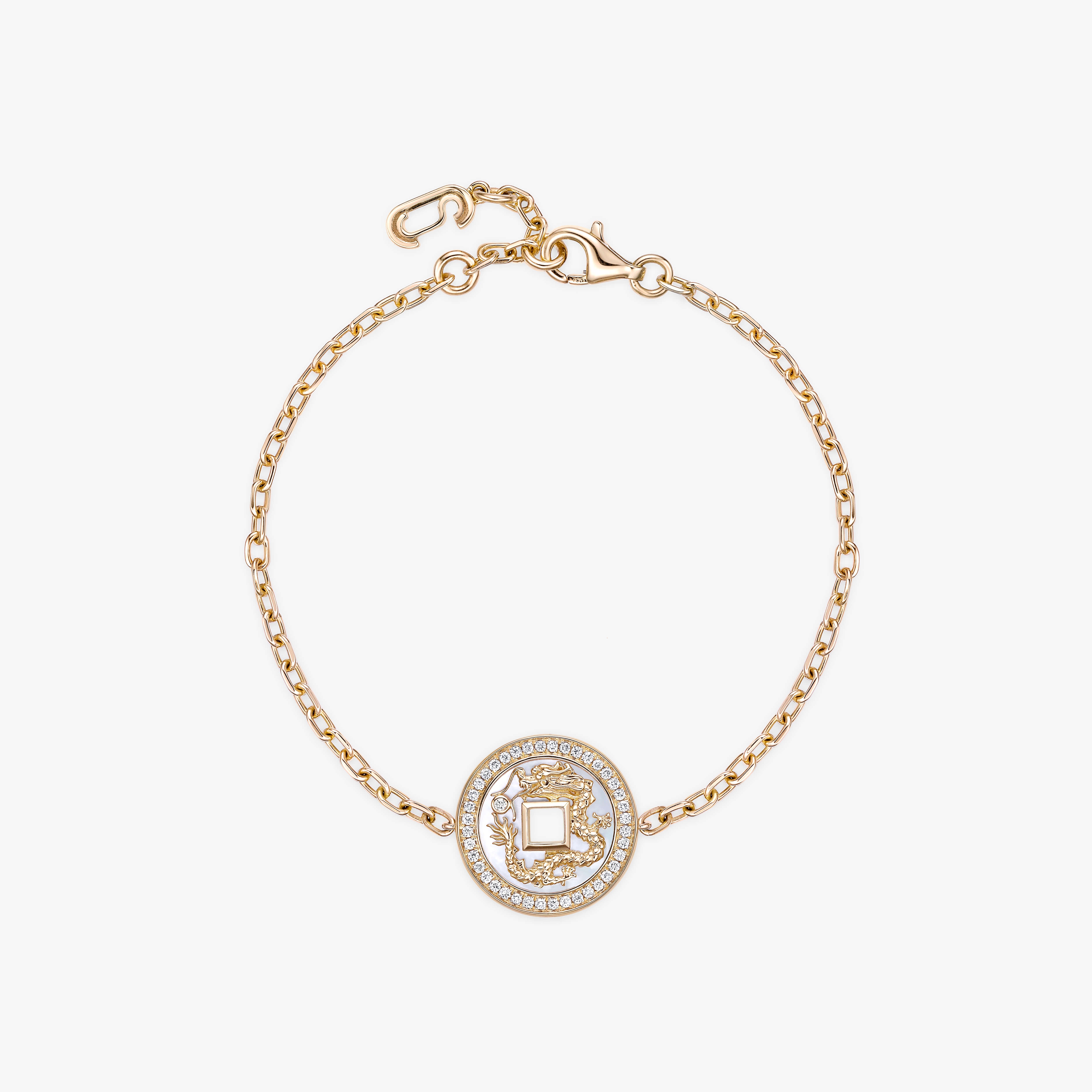 Our Eternal Dragon Bracelet is crafted from 18K recycled yellow gold and adorned with ornamental stones, including onyx, mother of pearl, jade, red jasper, turquoise, and lapis lazuli. This exquisite piece blends traditional artistry with modern elegance.