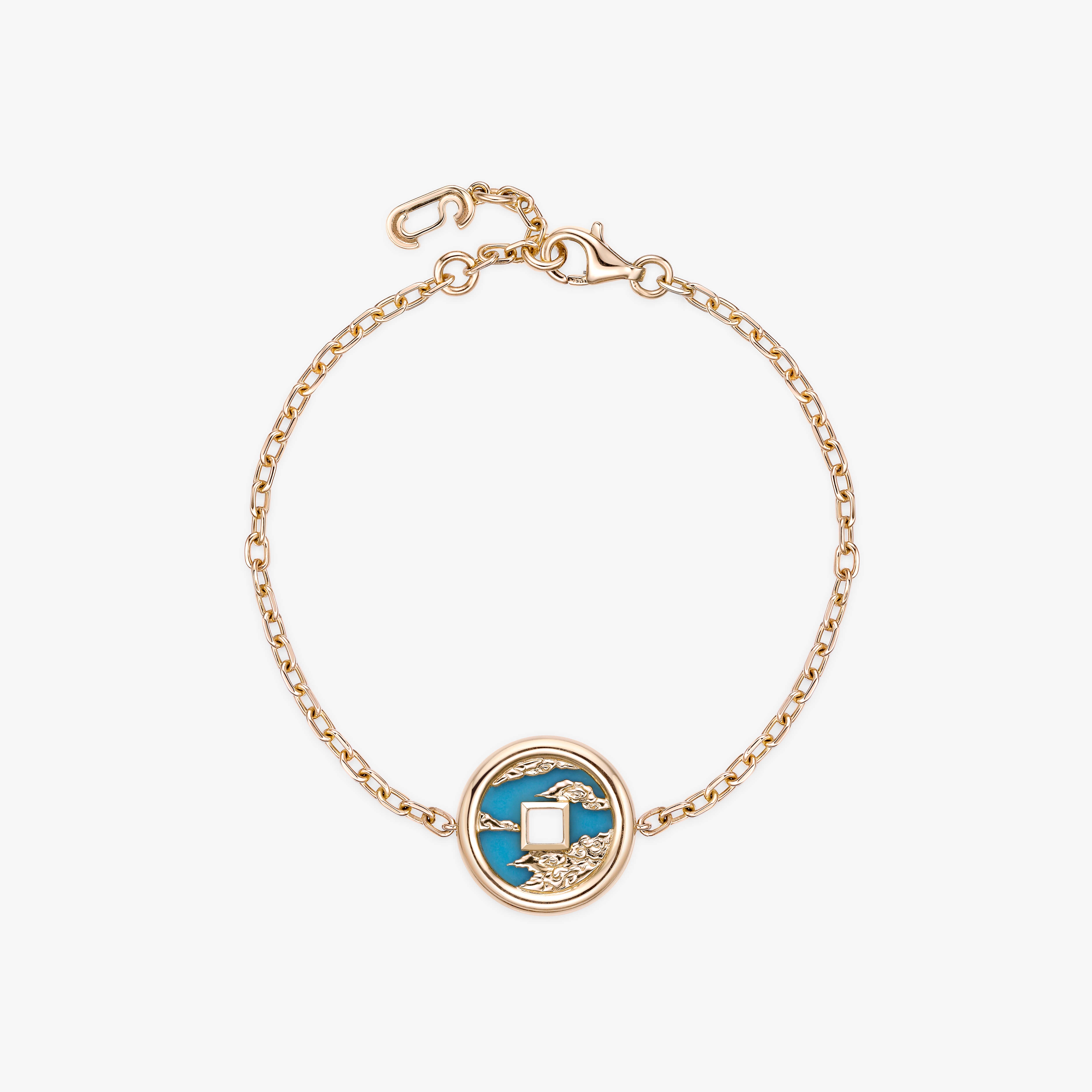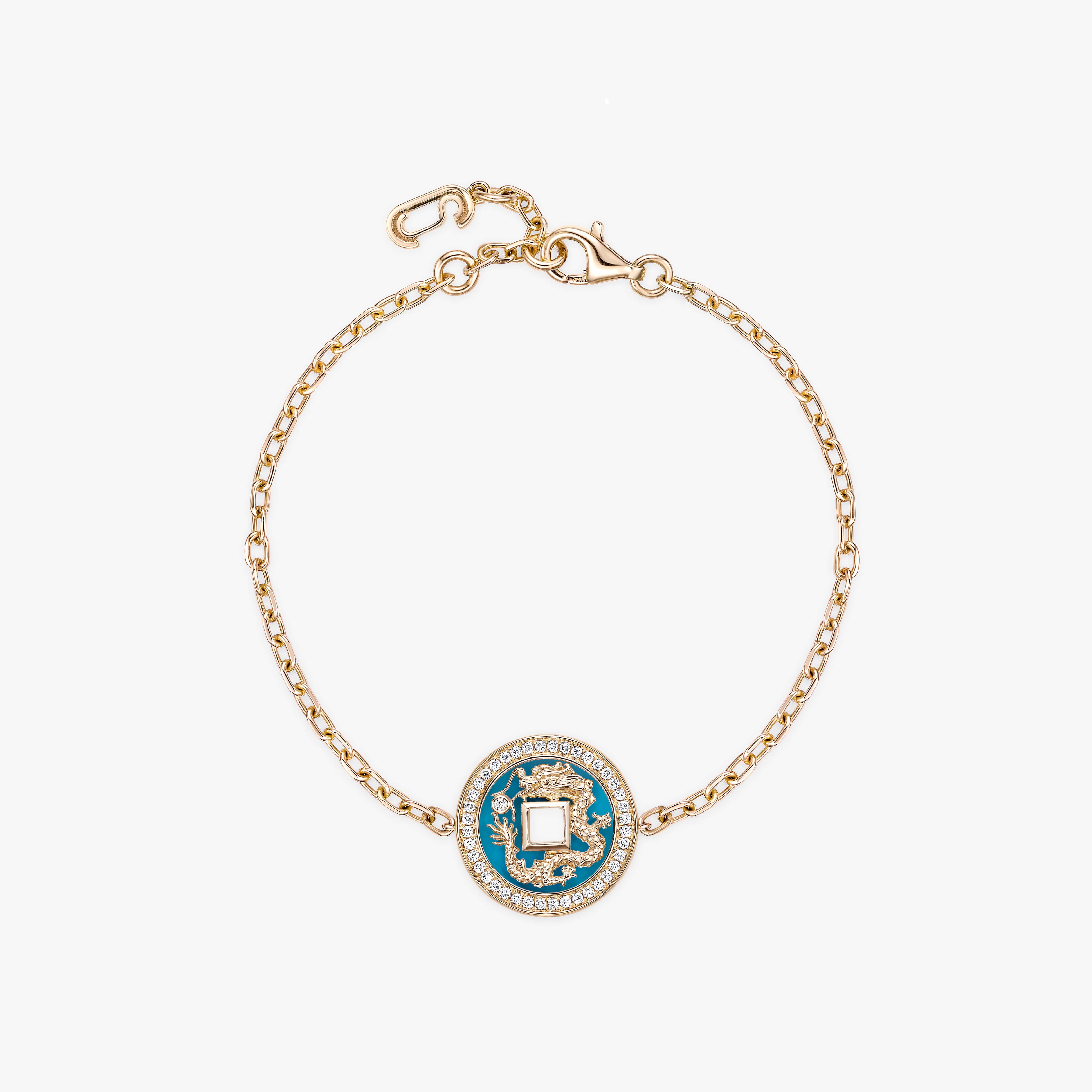 Our Eternal Dragon Bracelet is crafted from 18K recycled yellow gold and adorned with ornamental stones, including onyx, mother of pearl, jade, red jasper, turquoise, and lapis lazuli. This exquisite piece blends traditional artistry with modern elegance.