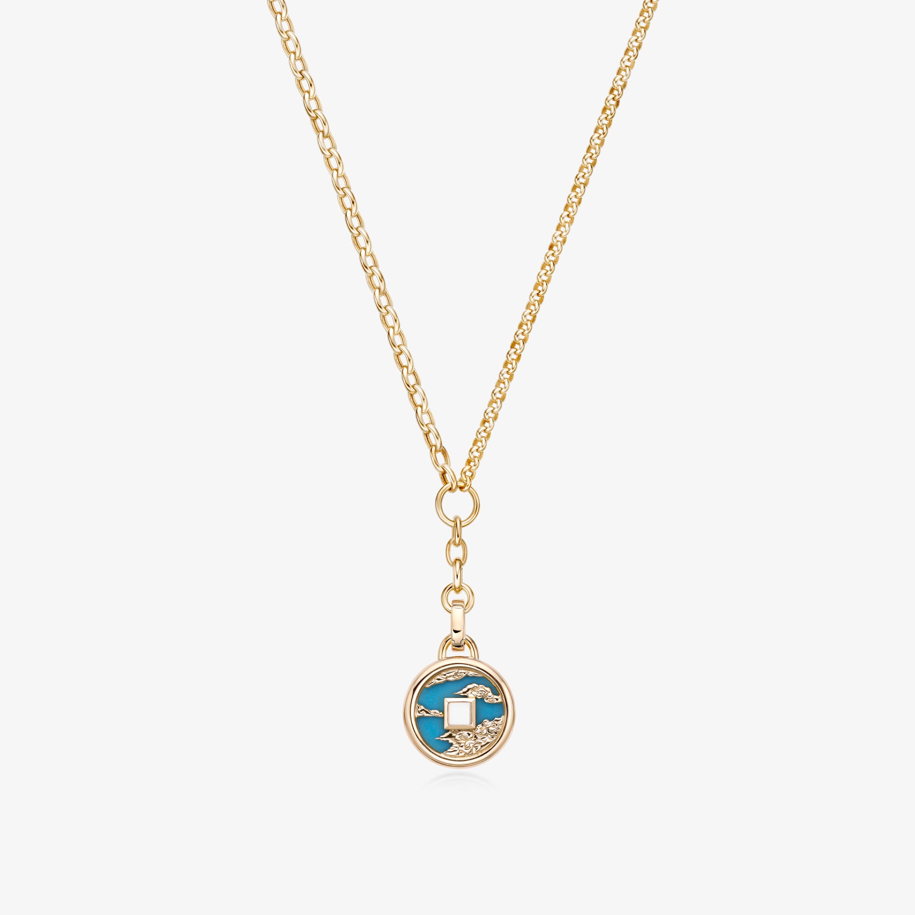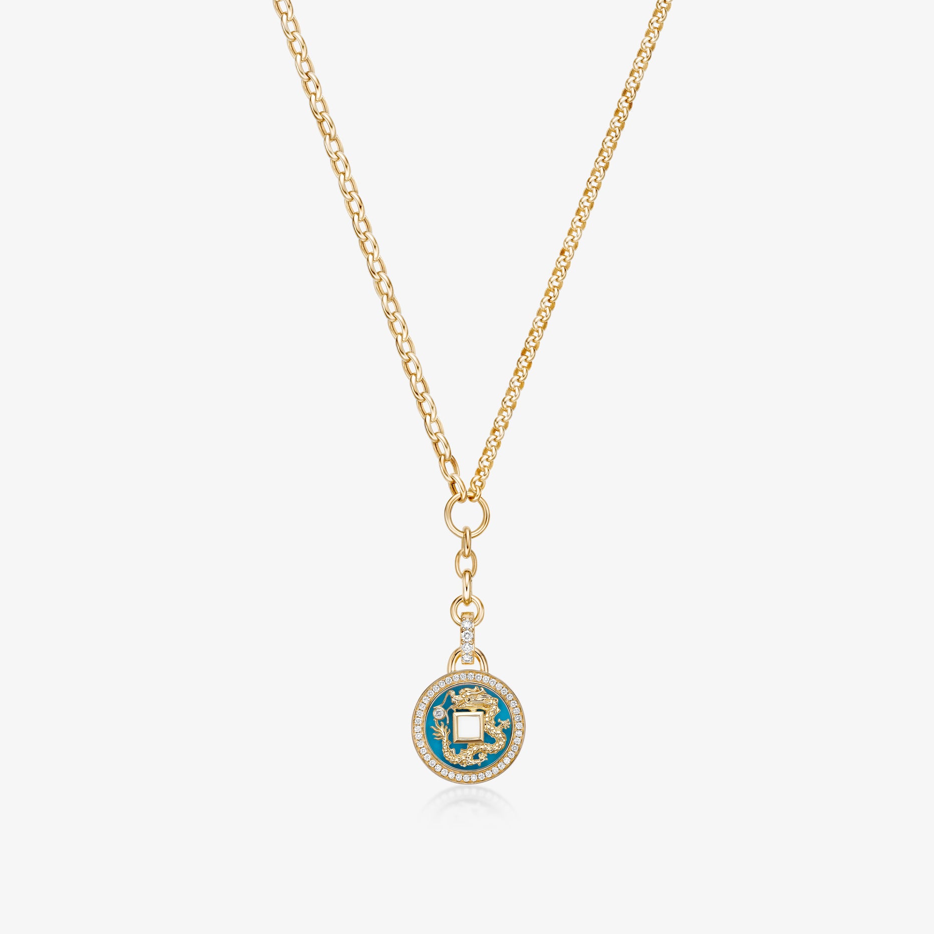 Our Eternal Dragon Medallion is crafted from 18K recycled yellow gold and adorned with delicate ornamental hardstone inlay, including onyx, mother of pearl, jade, red jasper, turquoise, and lapis lazuli. This exquisite piece blends traditional artistry with modern elegance.