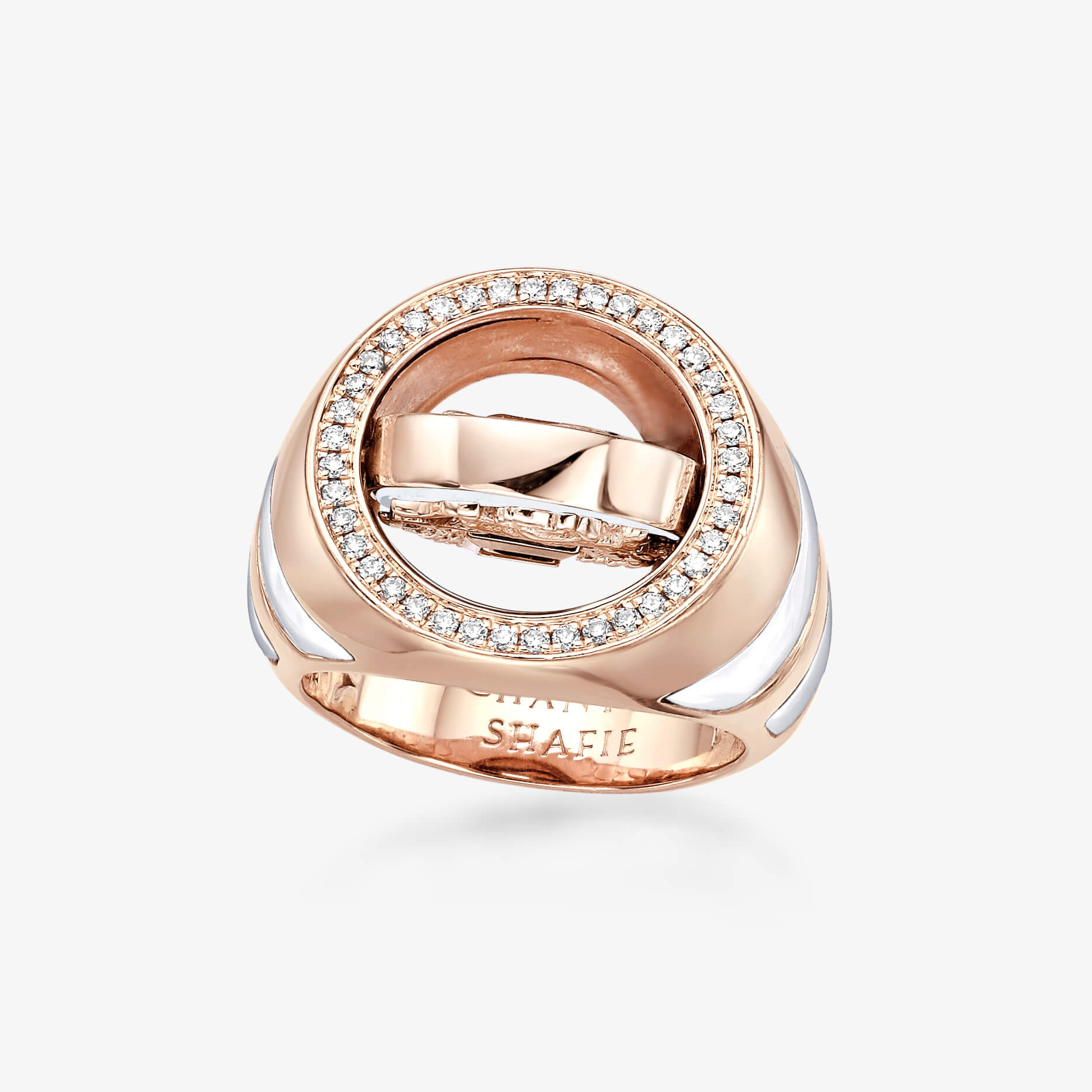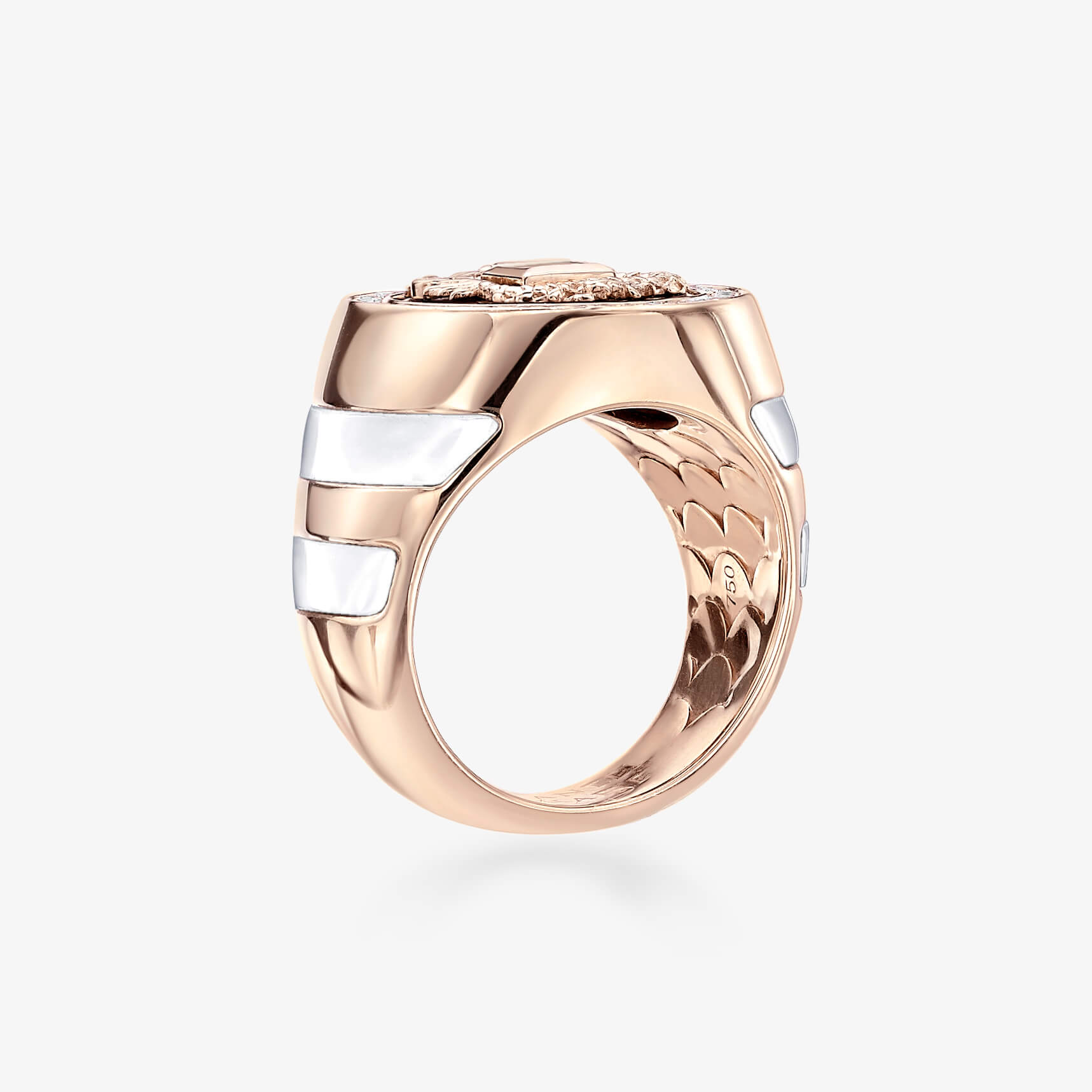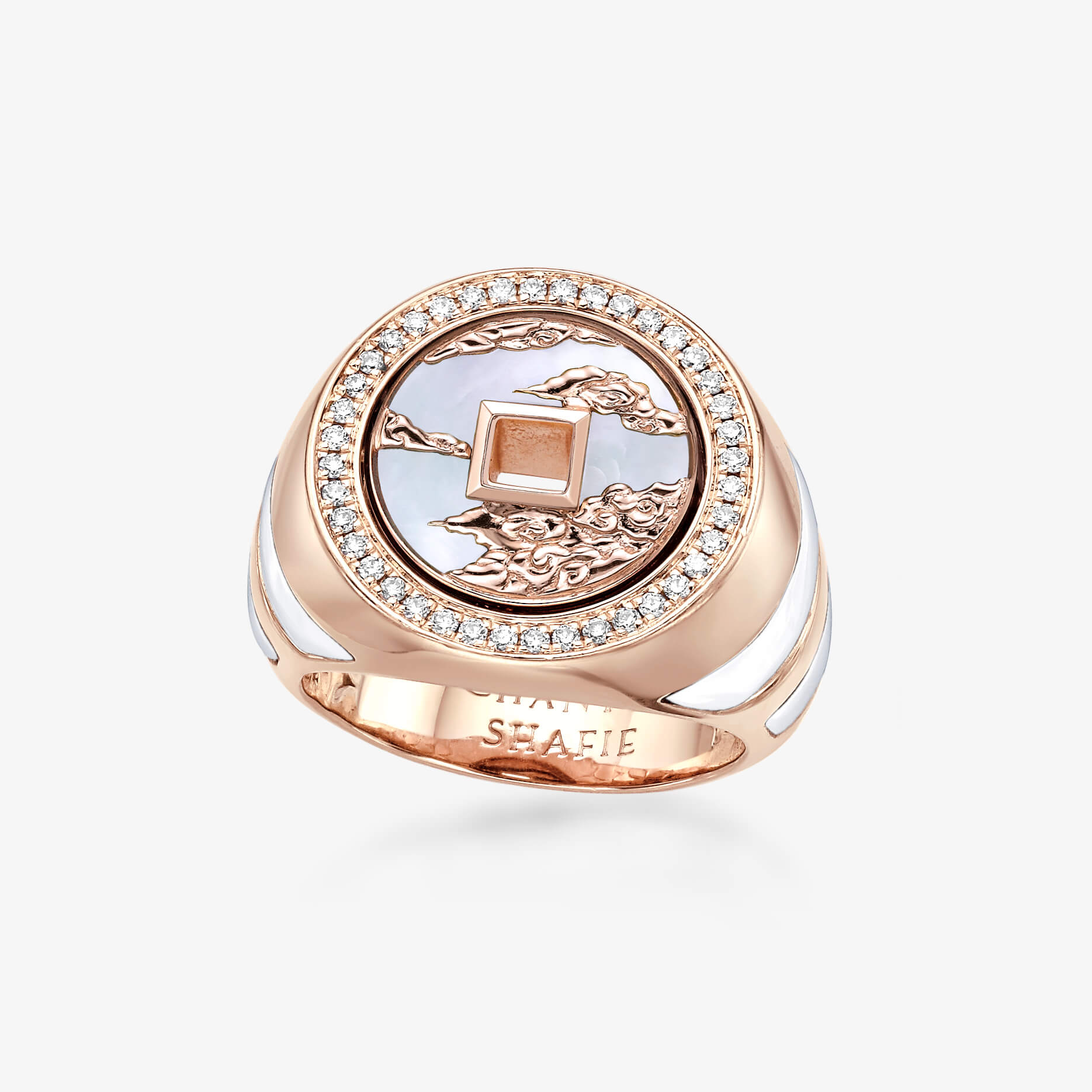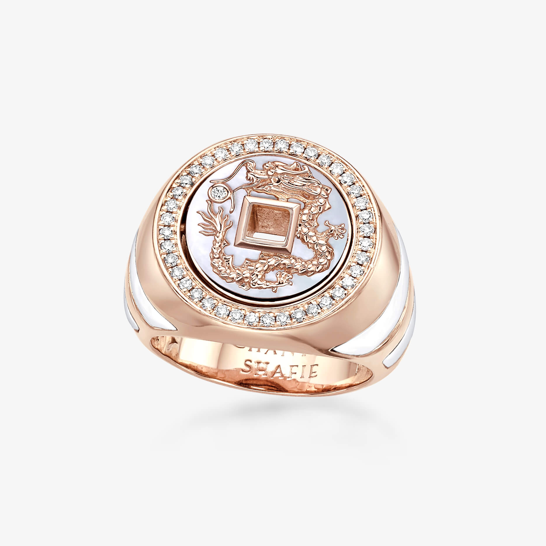Our Eternal Dragon Reversible Signet Ring is crafted from 18K recycled rose gold and adorned with delicate ornamental hardstone inlay, including onyx, mother of pearl, jade, red jasper, turquoise, and lapis lazuli. This exquisite piece blends traditional artistry with modern elegance. One of the unique features of this ring is its reversibility; with a simple rotation, you can wear either the lucky dragon or the auspicious clouds, allowing for versatile styling.