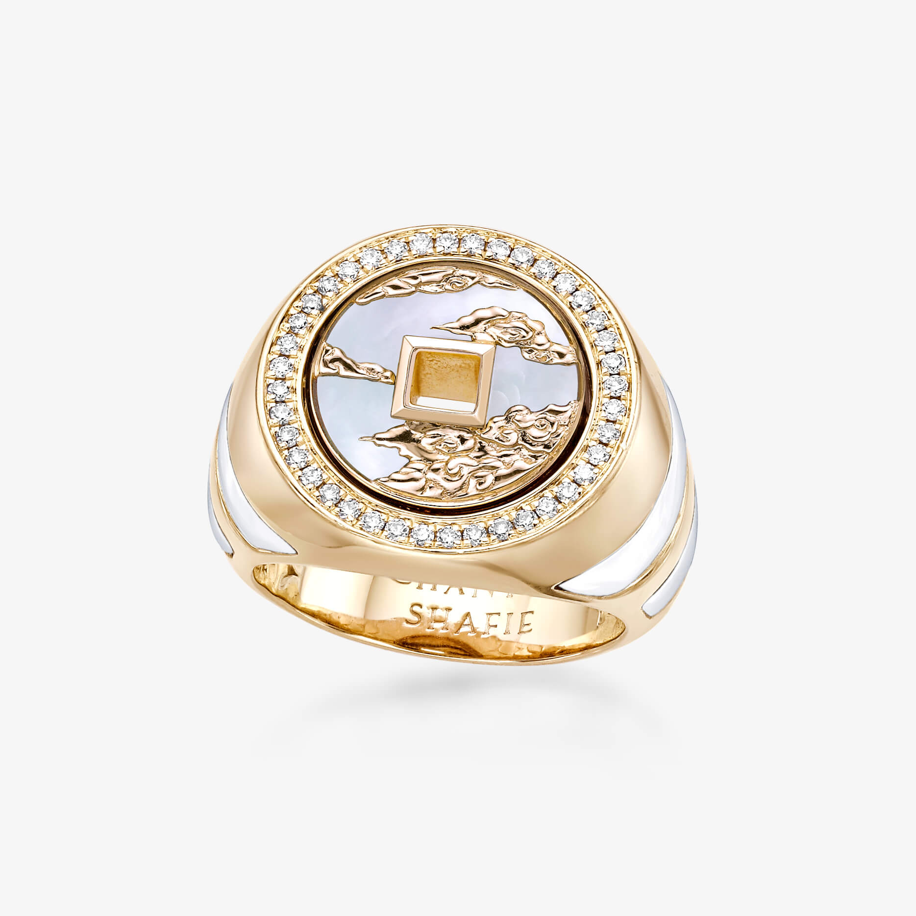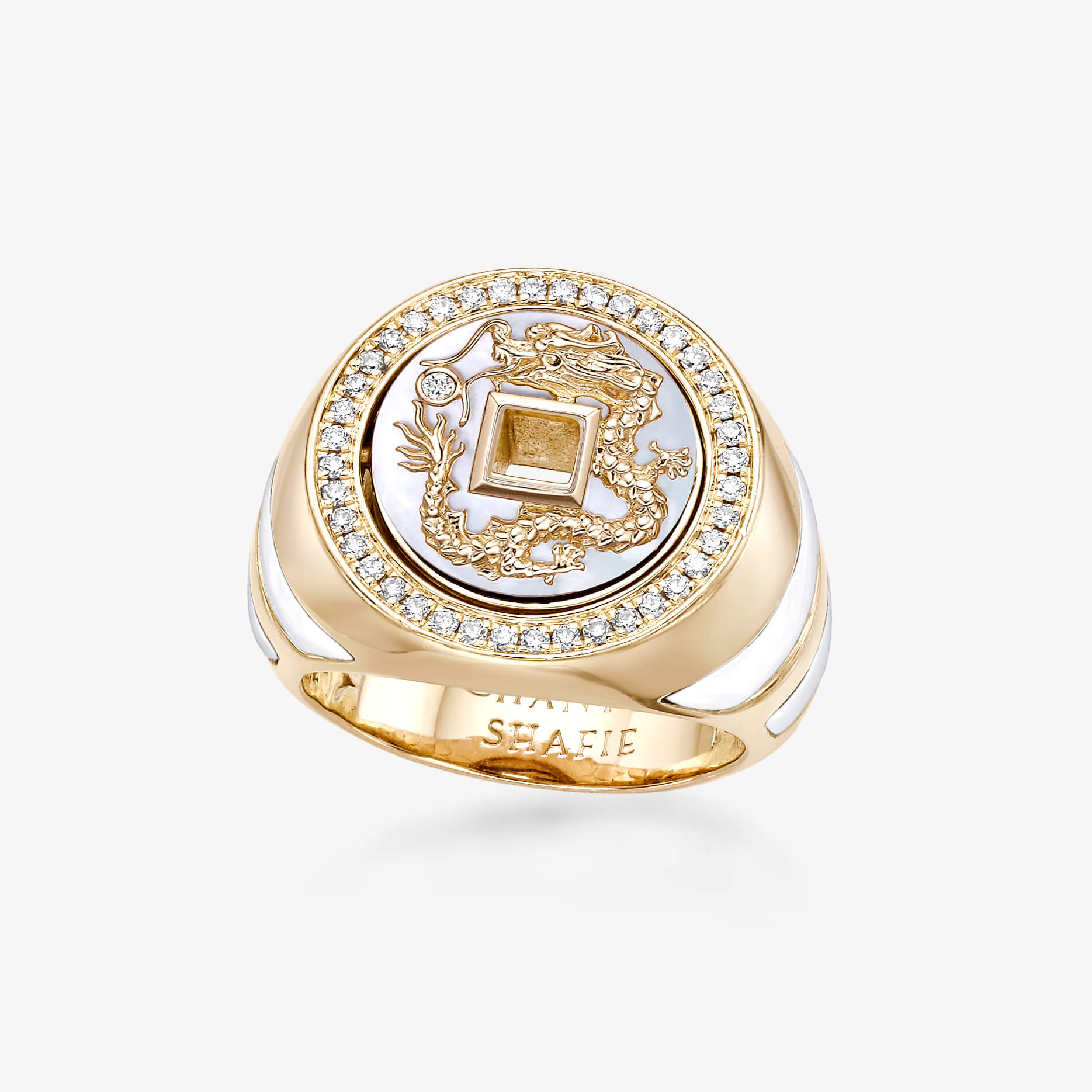 Our Eternal Dragon Reversible Signet Ring is crafted from 18K recycled yellow gold and adorned with delicate ornamental hardstone inlay, including onyx, mother of pearl, jade, red jasper, turquoise, and lapis lazuli. This exquisite piece blends traditional artistry with modern elegance. One of the unique features of this ring is its reversibility; with a simple rotation, you can wear either the lucky dragon or the auspicious clouds, allowing for versatile styling.