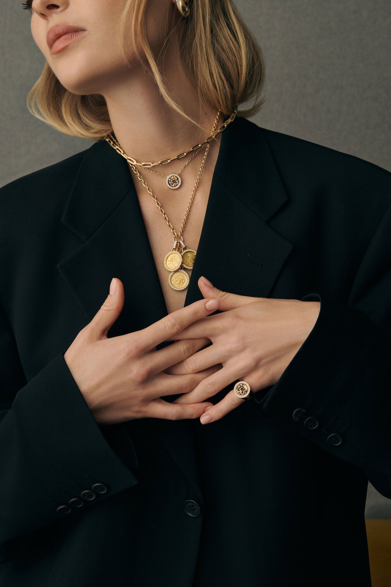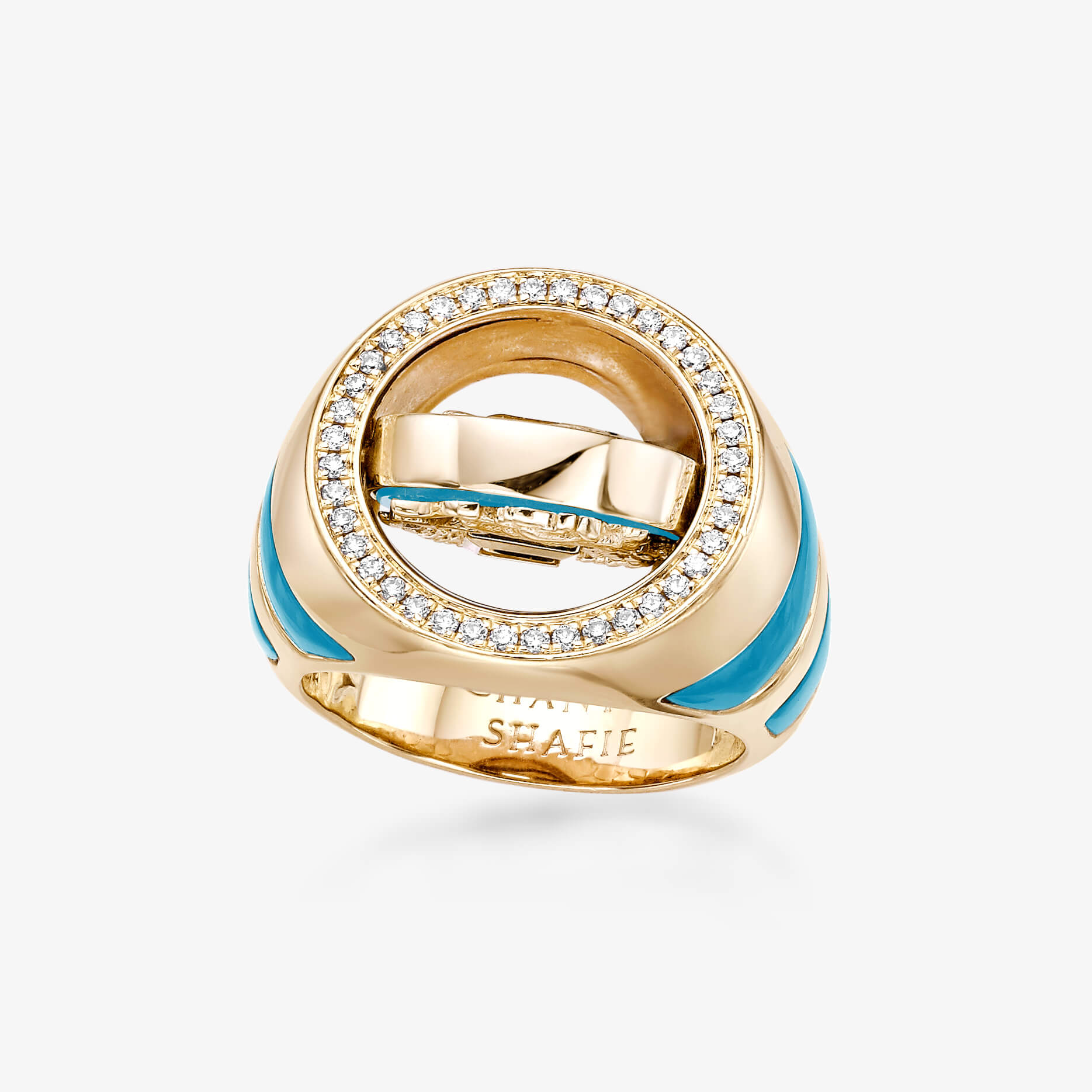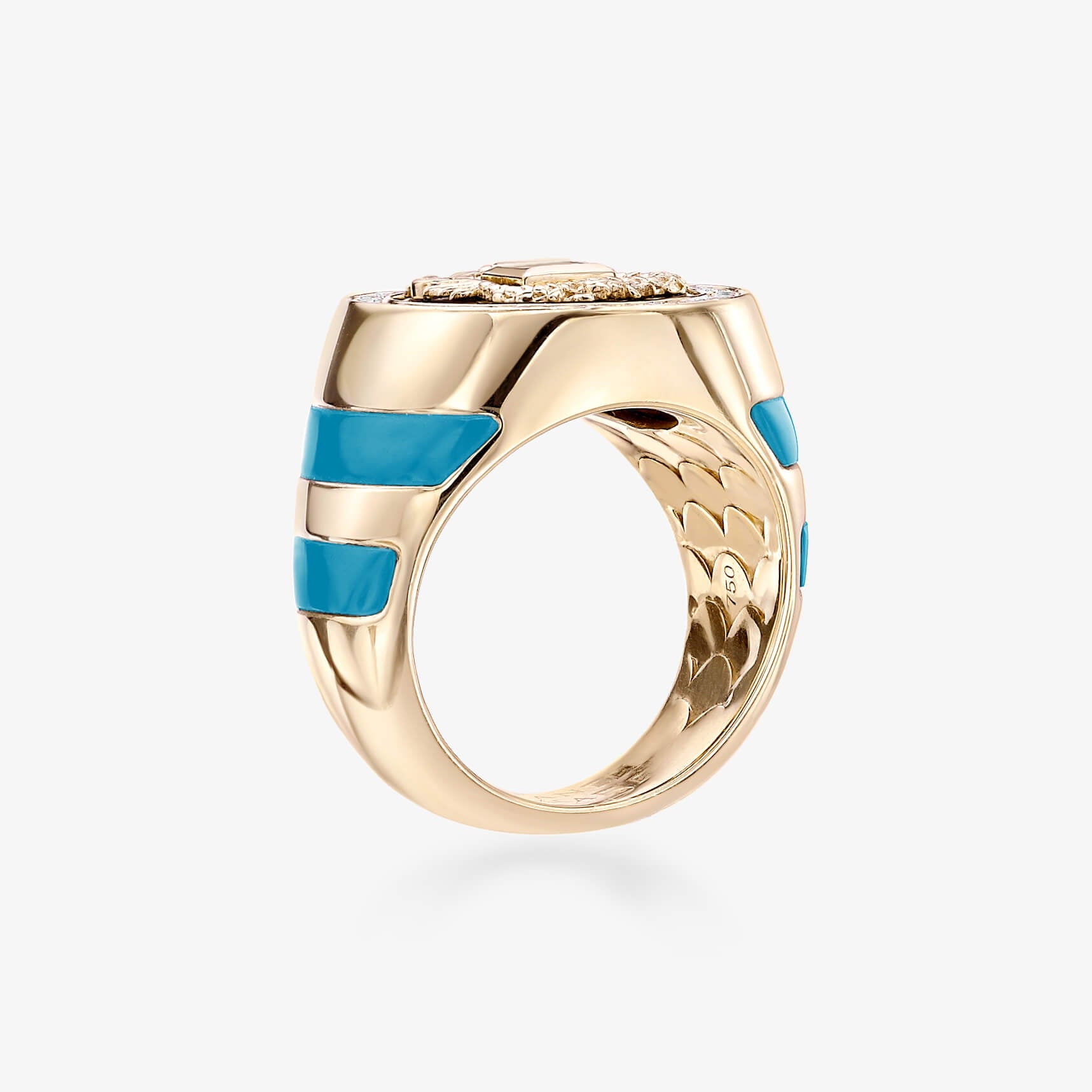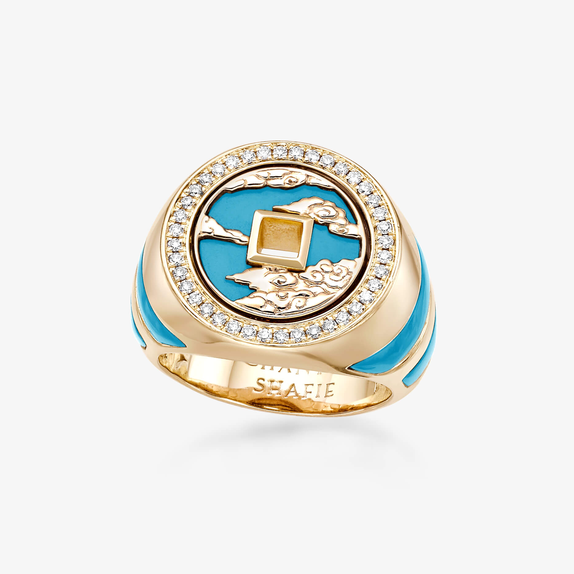 Our Eternal Dragon Reversible Signet Ring is crafted from 18K recycled yellow gold and adorned with delicate ornamental hardstone inlay, including onyx, mother of pearl, jade, red jasper, turquoise, and lapis lazuli. This exquisite piece blends traditional artistry with modern elegance. One of the unique features of this ring is its reversibility; with a simple rotation, you can wear either the lucky dragon or the auspicious clouds, allowing for versatile styling.