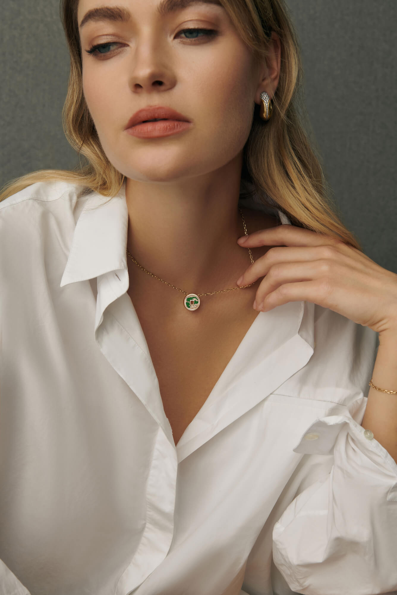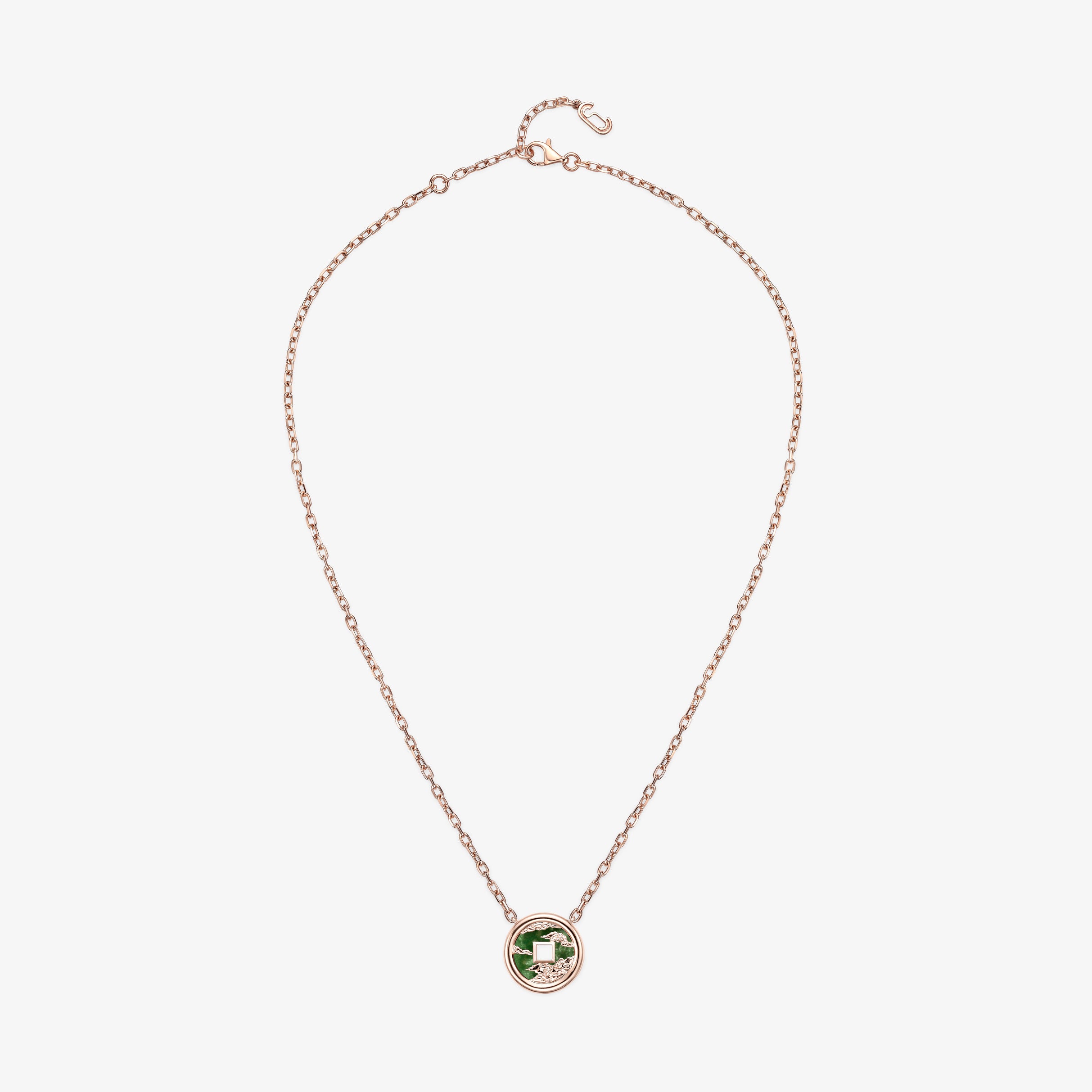 Our Eternal Dragon Necklace is crafted from 18K recycled rose gold and adorned with ornamental stones, including onyx, mother of pearl, jade, red jasper, turquoise, and lapis lazuli. This exquisite piece blends traditional artistry with modern elegance.