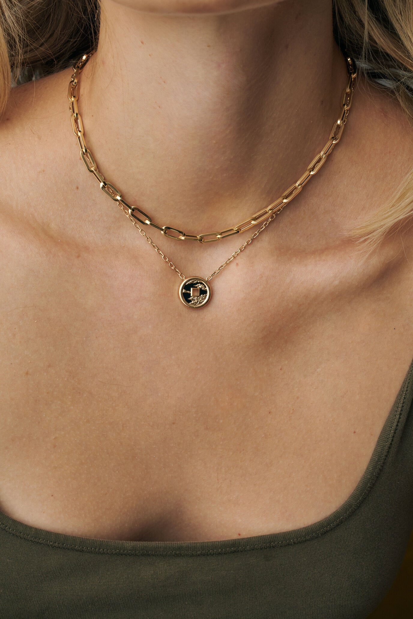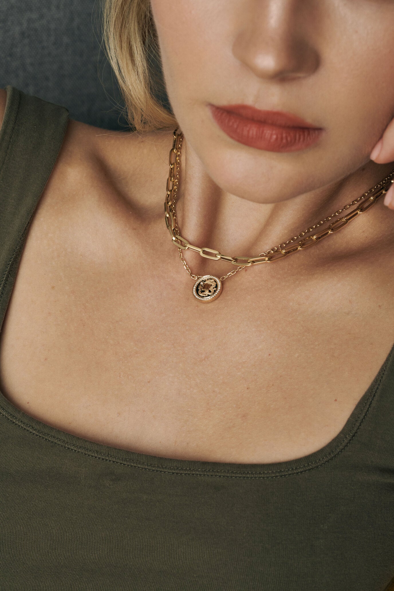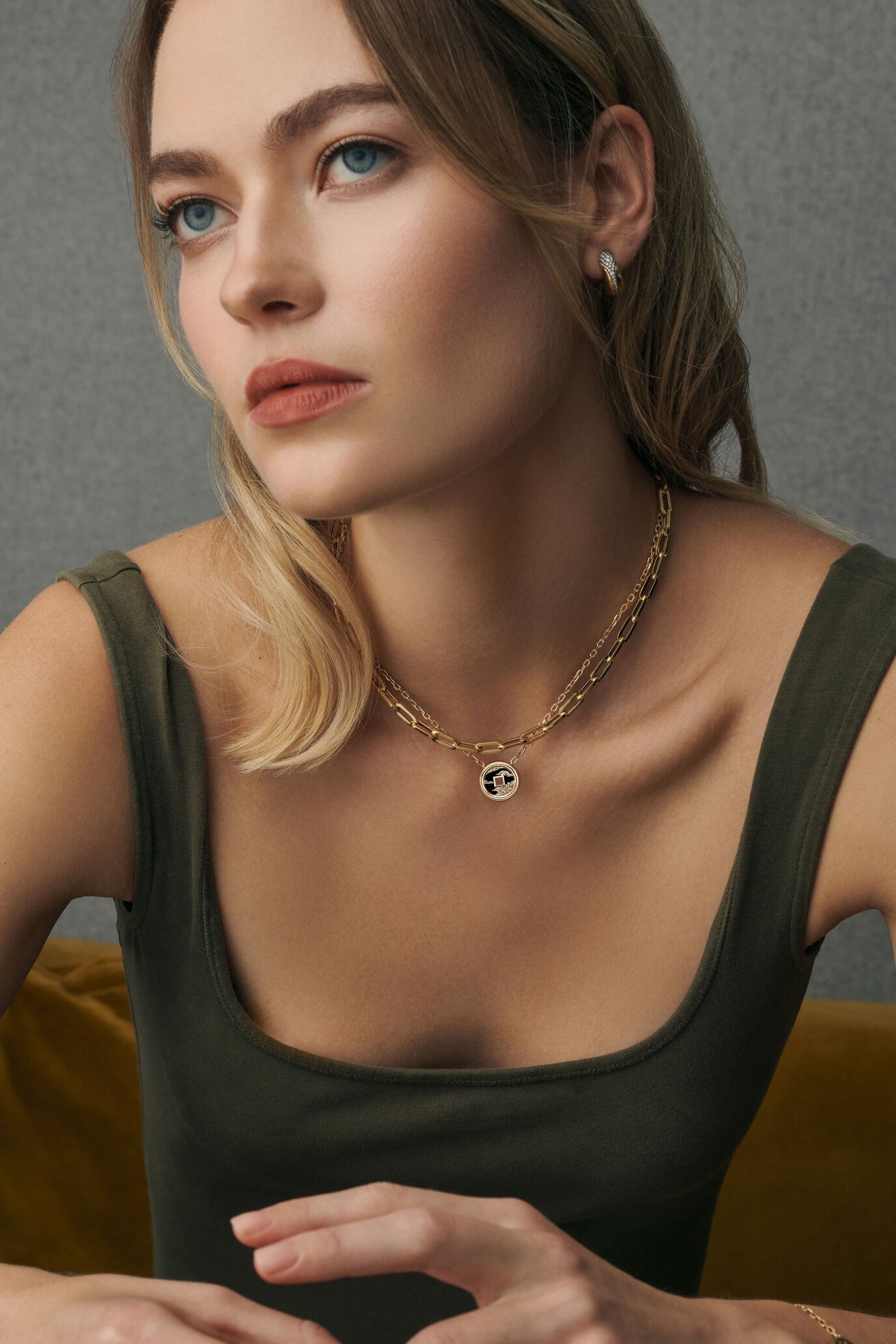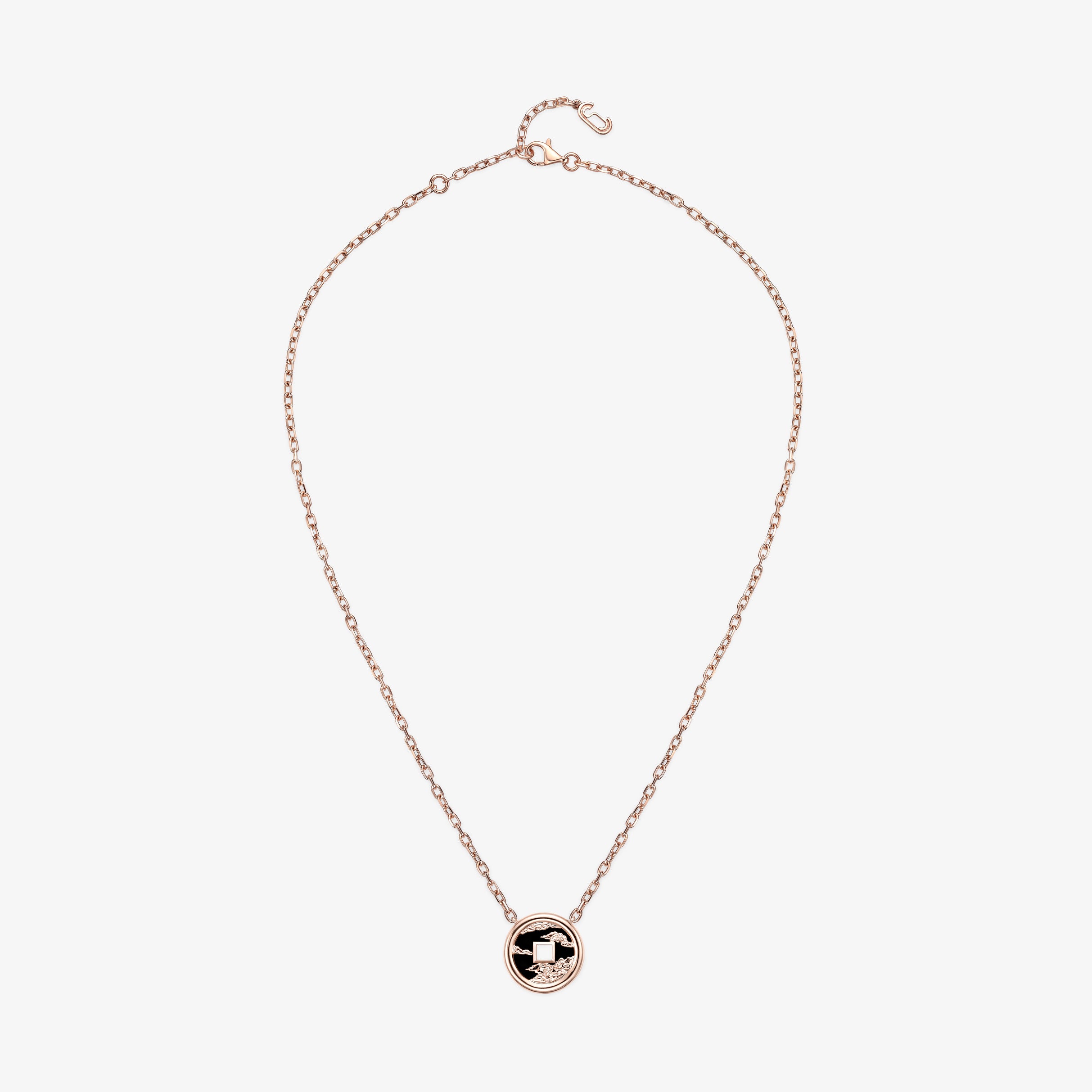 Our Eternal Dragon Necklace is crafted from 18K recycled rose gold and adorned with ornamental stones, including onyx, mother of pearl, jade, red jasper, turquoise, and lapis lazuli. This exquisite piece blends traditional artistry with modern elegance.