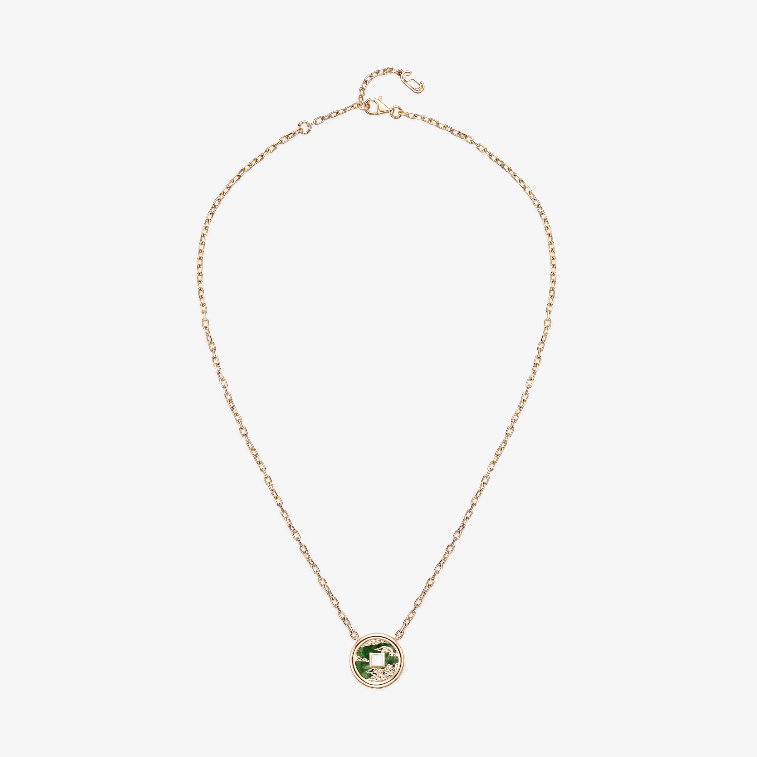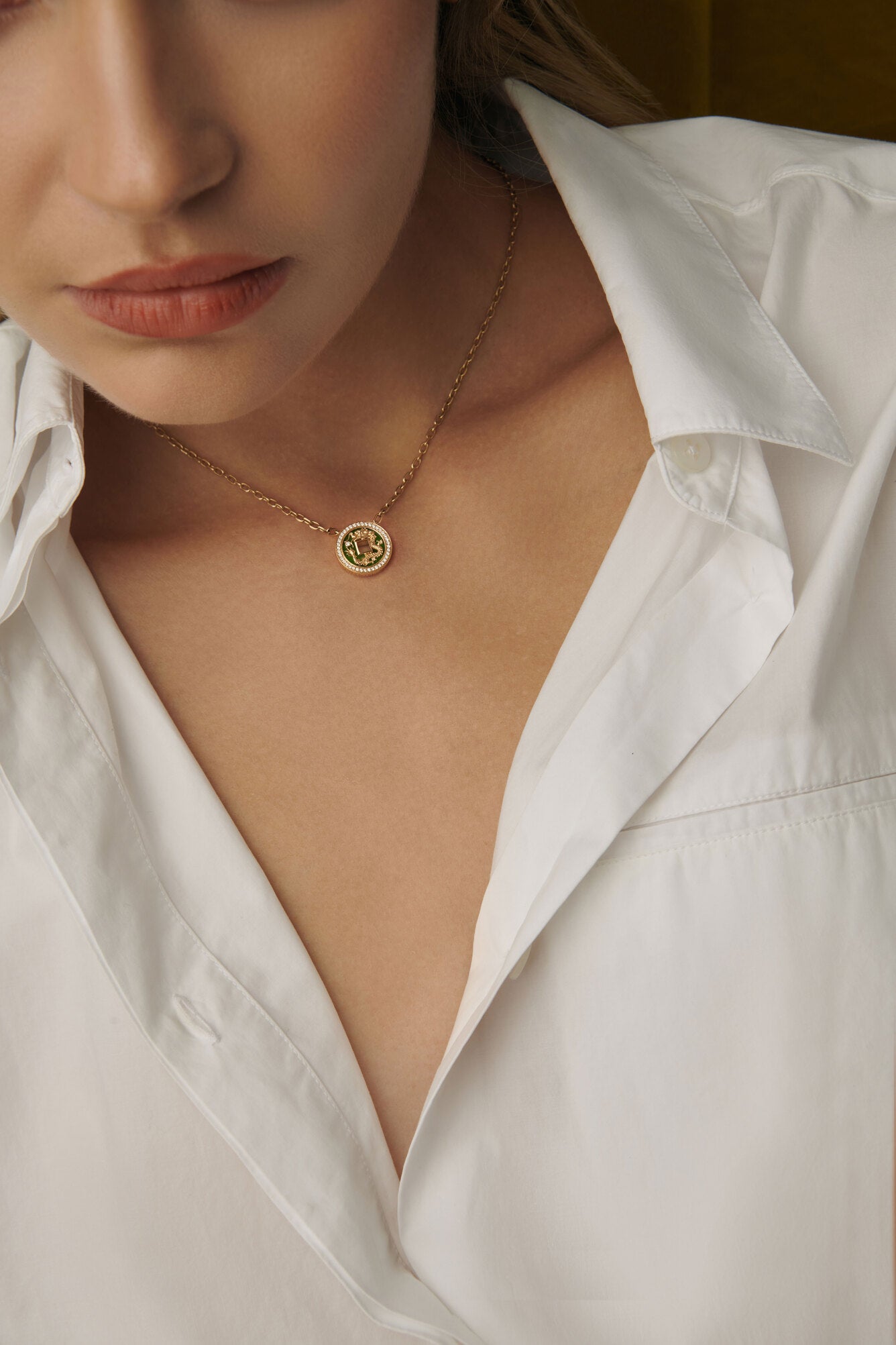 Our Eternal Dragon Necklace is crafted from 18K recycled yellow gold and adorned with ornamental stones, including onyx, mother of pearl, jade, red jasper, turquoise, and lapis lazuli. This exquisite piece blends traditional artistry with modern elegance.