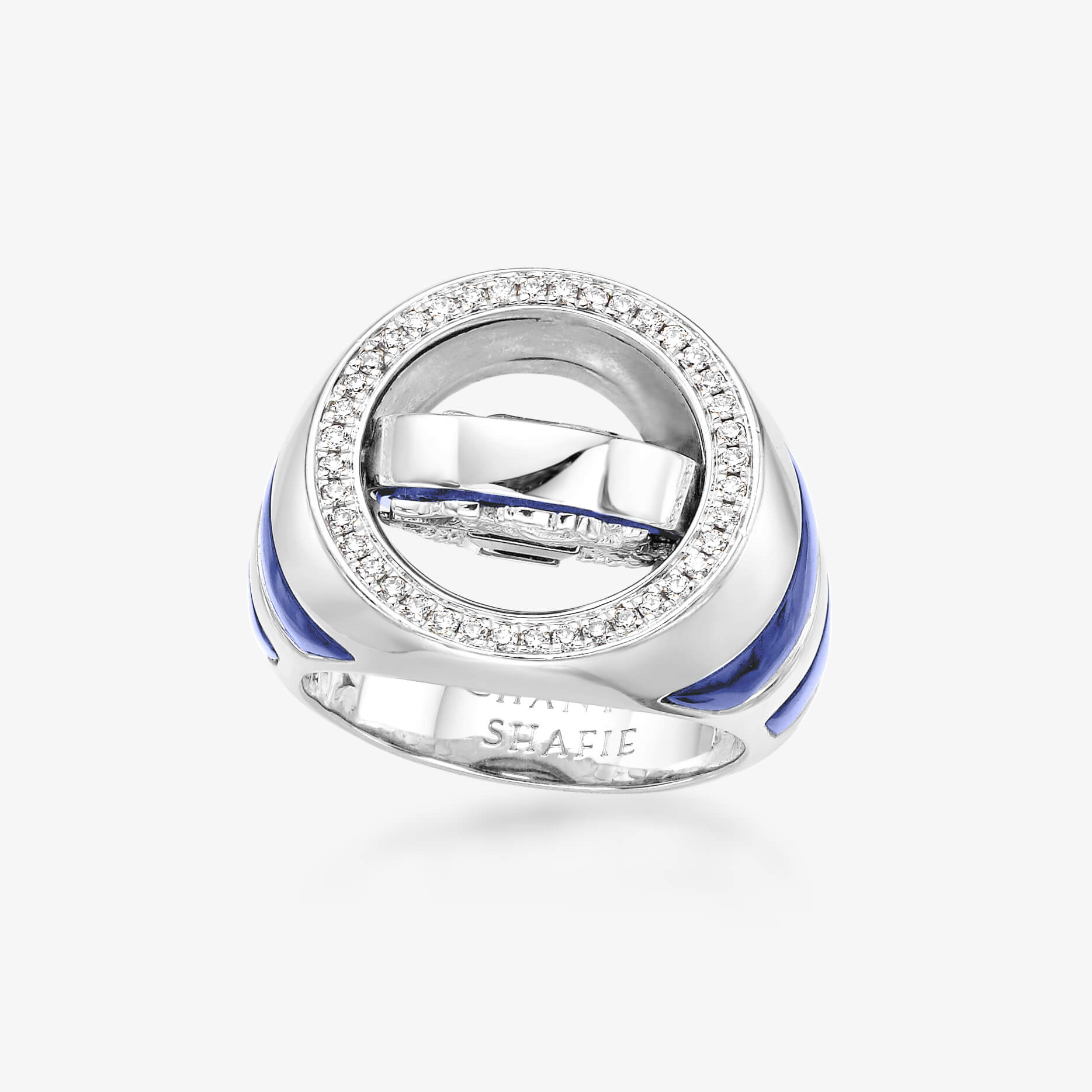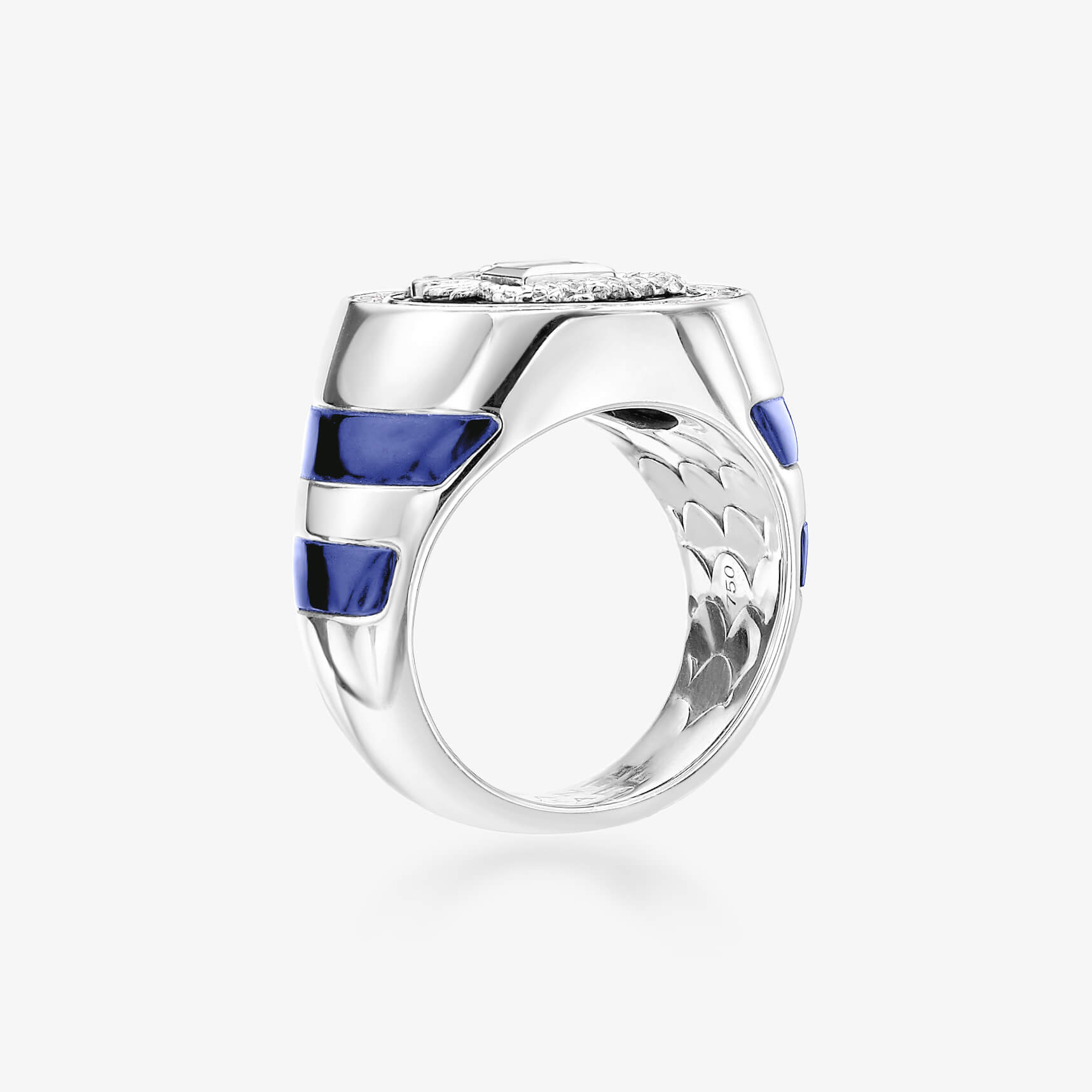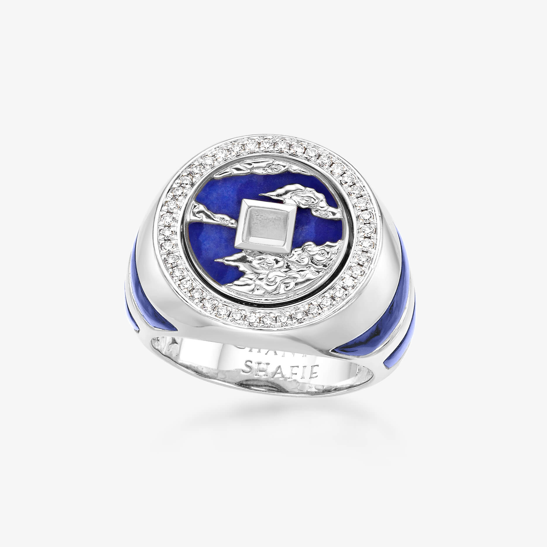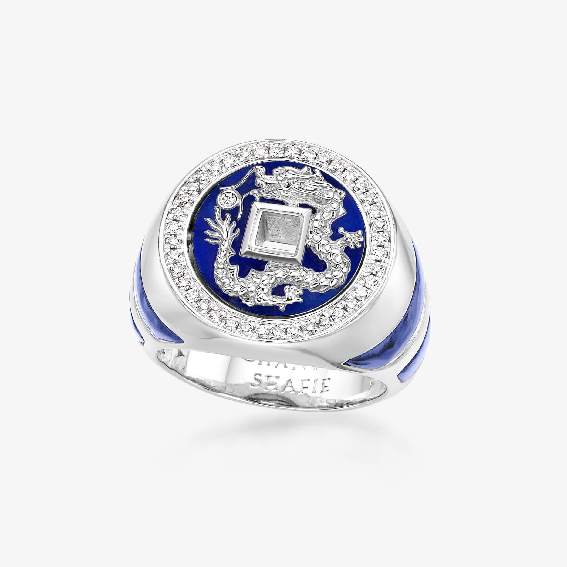 Our Eternal Dragon Reversible Signet Ring is crafted from 18K recycled white gold and adorned with delicate ornamental hardstone inlay, including onyx, mother of pearl, jade, red jasper, turquoise, and lapis lazuli. This exquisite piece blends traditional artistry with modern elegance. One of the unique features of this ring is its reversibility; with a simple rotation, you can wear either the lucky dragon or the auspicious clouds, allowing for versatile styling.